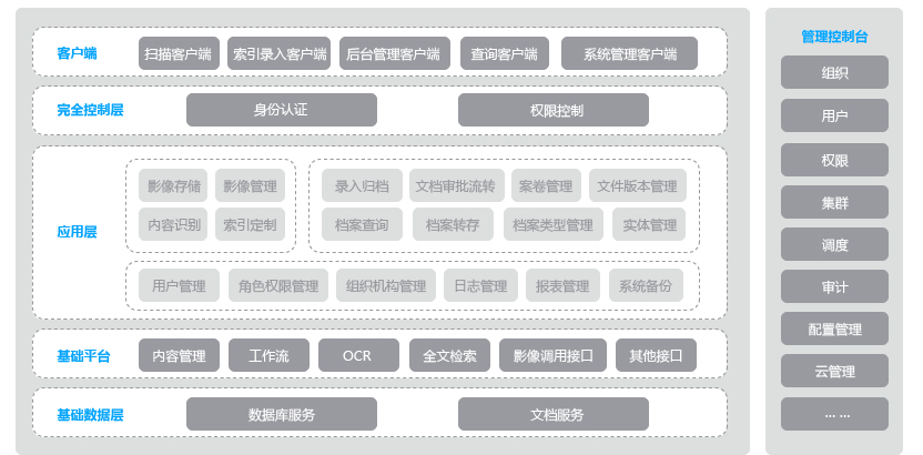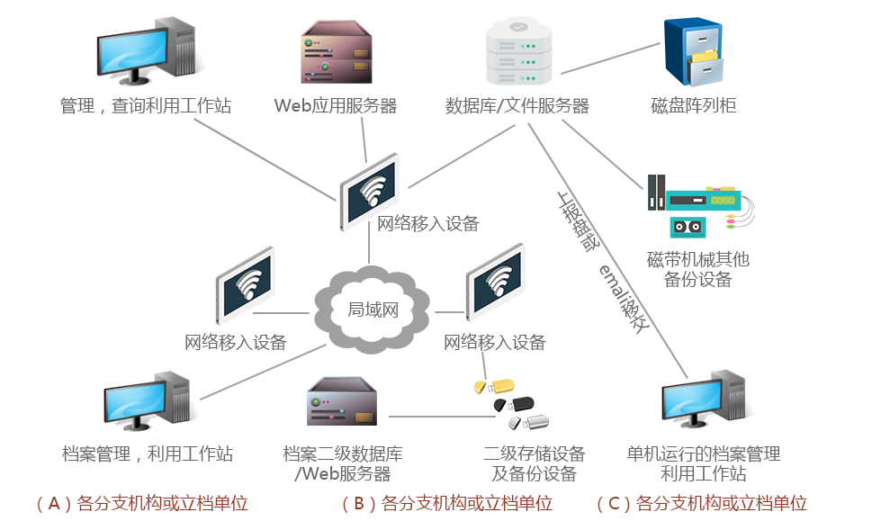 檔案管理系統主要分為:電子文件管理中心子系統、數字檔案管理子系統、檔案檢索子系統,三大子系統。 具有系統設置、權限管理、數據錄入、整編組卷、檢索利用、借閱、銷毀、統計報表、數據轉換等功能模塊。 可在網絡環境下實時瀏覽檢索到的檔案文件、圖像、圖形等,還可在權限允許范圍內下載檔案。可將檔案部門現有的檔案目錄管理系統中的數據直接轉入新的企業檔案管理系統,可在系統中繼續管理上傳文件,提供借閱、歸還、催還等功能。